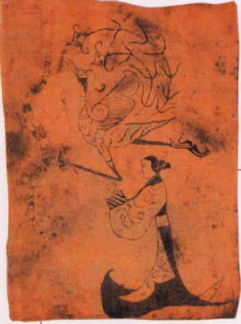 長沙楚墓先后出土了兩幅旌幡性質(zhì)的帛畫。其一稱《人物龍鳳帛畫》,畫中有一身著華美衣裙的女子,雙手拱拜,昂首飛舞的鳳和蜿蜒而動的龍好似向天國飛去。另一幅《人物御龍帛畫》畫的是一俄冠長袍、神態(tài)從容的男子頭頂華蓋,駕馭巨龍遨游飛馳,龍下面繪有一條魚,栩栩如生;龍尾以極簡練手法畫出一引頸放歌的孤鶴。兩幅畫顯然與戰(zhàn)國時(shí)流行的飛升成仙思想有關(guān),通過衣冠服飾表現(xiàn)了人物的身份,儀態(tài)肅穆,線條流暢,設(shè)色采用平涂與渲染兼用的方法,顯得莊重富麗,著實(shí)體現(xiàn)了當(dāng)時(shí)書畫的水平和特點(diǎn)。