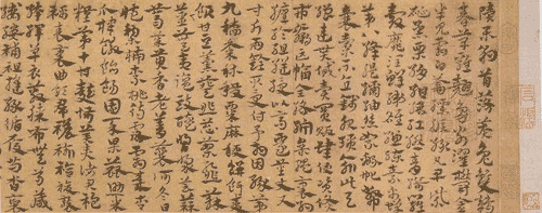 其中,宋克擅長(zhǎng)真、行、草諸體,尤以章草名噪一時(shí),作品有草書《急就章》、《出師頌》、《月儀帖》、《豹奴帖》等。宋克(公元1327-1387年),字仲溫,號(hào)南宮生,吳郡長(zhǎng)洲(今江蘇蘇州)人,少年磊落清爽,任俠使氣,常以李太白、蘇東坡自比。他曾跟饒介學(xué)二王書法,故特別鐘情于草書。他最負(fù)盛名的章草,揮運(yùn)自如,瀟灑縱橫,十分契合其性格。明代王世貞在《州山人稿》中說(shuō):“嘗論章草自二王后,僅一蕭子云,即顏(真卿)、柳(公權(quán))、蘇(軾)、米(芾)以至趙吳興(孟頫),負(fù)當(dāng)代能聲,而不一及之。……及觀仲溫《急就章》結(jié)意純美,以為征誅之后,獲睹揖讓,而后偶取皇象石本閱之,大小行模及前后缺處若一,唯波撇小異耳,以豈亦仲溫臨象本耶!爆F(xiàn)藏天津藝術(shù)博物館的宋克章草《急就章》寬13.8厘米,長(zhǎng)232.7 厘米,為洪武二十年(1387)年所作。字間茂密,意態(tài)古雅,趨于對(duì)“古質(zhì)” 的汲取,字形多顯隸意,使得整幅作品端莊而流利。