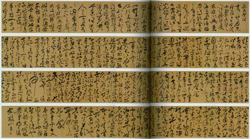 從成化、弘治時(shí)期開(kāi)始,明代書法發(fā)生了新的變化。朝野書家普遍開(kāi)始崇法魏晉法帖,以暢神適意、抒發(fā)個(gè)人情感為目的。吳門書法隨之昌盛起來(lái)。明王世貞的《藝苑卮言》云:“天下法書歸吾吳,而京兆允明為最,文待詔征明、王貢士寵次之!弊T拭(1460——1526)號(hào)枝山,因右手有六指,故自號(hào)枝指生,江蘇長(zhǎng)洲(今蘇州)人,工詩(shī)文,尤精書法,與文徵明、唐寅、徐禎卿并稱“吳中四才子”。祝允明博學(xué)多師,工小楷、行、草,尤以狂草最顯本色,揮毫落紙如行云流水,瀟灑跌宕,其行筆如疾風(fēng)掃落葉,參差翻轉(zhuǎn)。其作品如《李白歌風(fēng)臺(tái)》卷、《赤壁賦》卷等。
