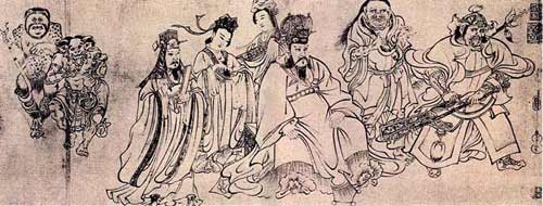 初唐的閻立本發(fā)揚(yáng)了中原作風(fēng),他的《歷代帝王圖》一直是繪畫史上備受推崇的作品,尉遲乙僧則代表了邊陲作風(fēng)。盛唐的吳道子在宗教畫中創(chuàng)設(shè)了“吳家樣”,他的《天王送子圖》描繪佛祖釋迦牟尼降生為悉達(dá)王子后,其父凈飯王和摩耶夫人抱著他去朝拜大自在天神廟時(shí)諸神向他禮拜的故事。畫中的人、鬼神、獸等完全加以中國(guó)化、道教化,體現(xiàn)了佛教在中國(guó)本土至唐朝與本地日趨融合的一面。此圖情狀歷歷,技藝高超,想象奇特,令人神馳目眩。所謂衣帶當(dāng)風(fēng),飄然間極盡風(fēng)致,因此被尊為“畫圣”。擅長(zhǎng)人物的名家還有周昉、梁令瓚、陳閎、李真、孫位等人。上述畫家都有傳作或摹本存世。個(gè)別作品還屬真跡。