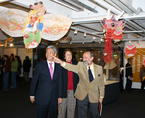 | 秘魯國家博物館館長(右)、秘魯文委主任(中)和中國駐秘魯殷恒民大使一同參觀精美的風(fēng)箏作品 |