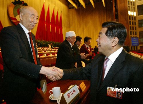 賈慶林與會(huì)上發(fā)言的政協(xié)委員握手